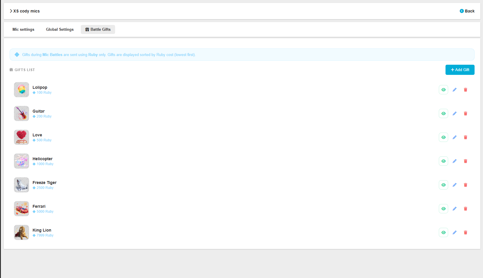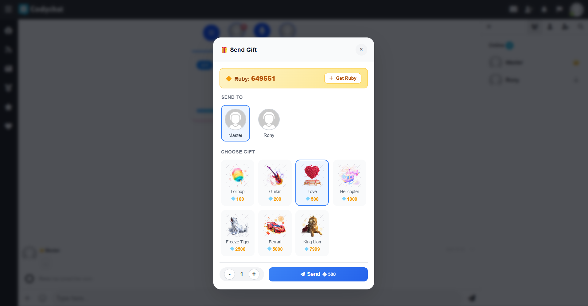 💠Ruby Gift System Custom mic gifts sent in Ruby currency during battles — supports fullscreen animation or notification-only display mode.