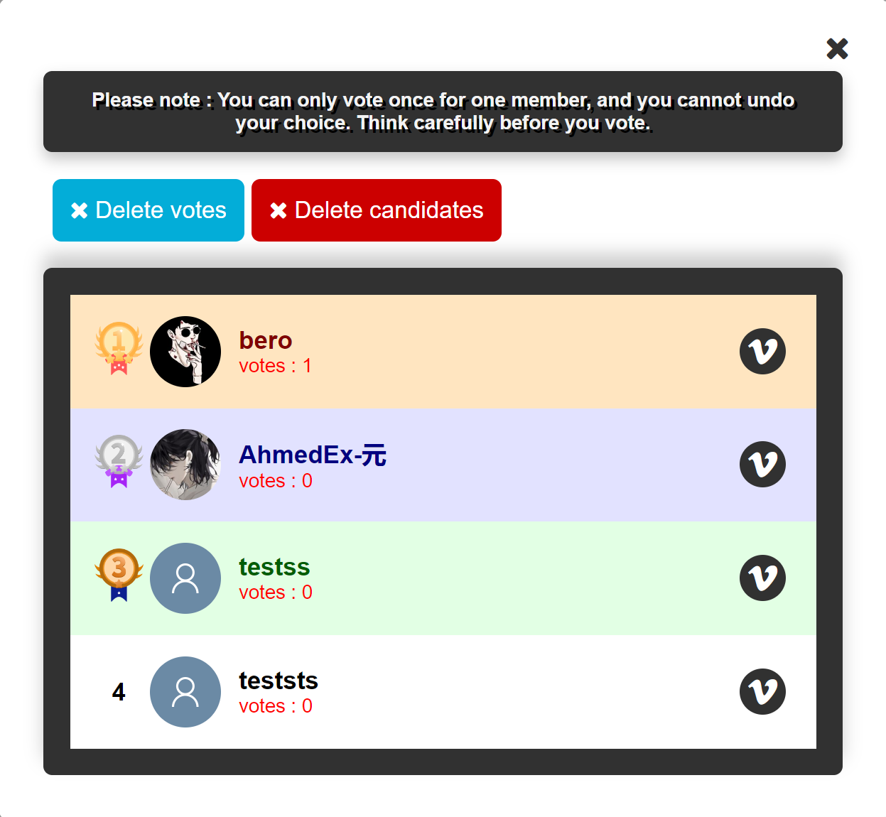 with this addon you can make a vote for your members, and you can set a title for your vote and you can set any member to the voting list and allowing the other members vote to the members in the list.